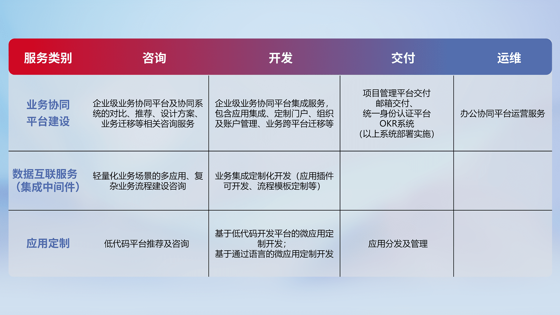 针对钉钉、、、企微、、、、IDaas等平台级产品提供产品的规划、、、、方案、、交付、、、、定制化开发等服务,,,,实现如统一协同办公、、、、智能客户服务、、、混合会议管理、、、、智能数据查询、、、等业务场景,,,实现数字化转型。。。。